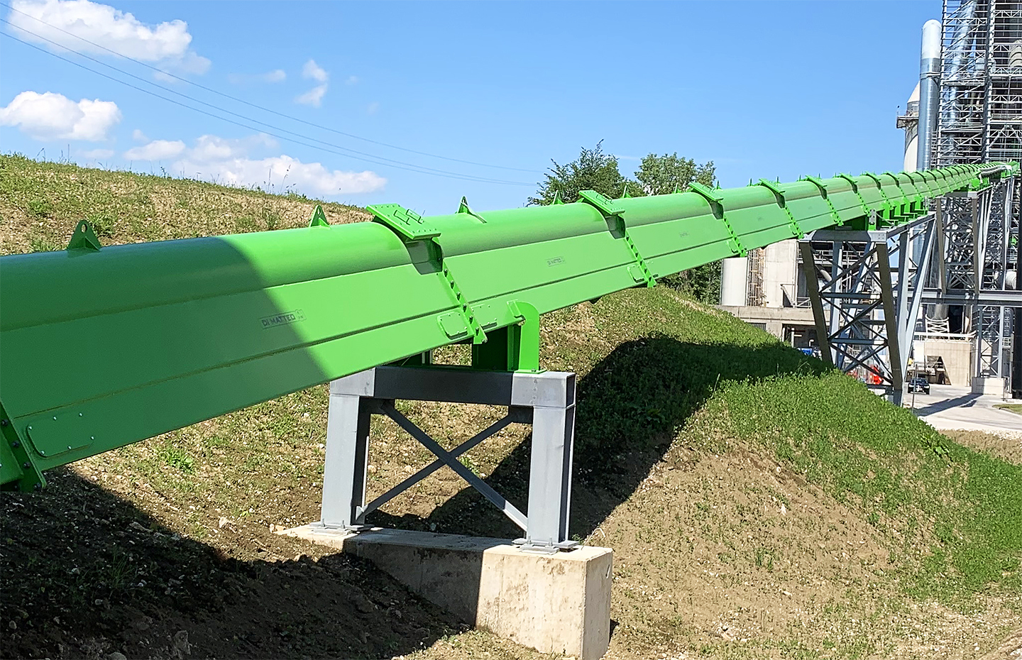 DI MATTEO offers Belt Conveyors in various configurations, including flat belt and troughed belt designs. Pipe Belt Conveyors enable safe conveying of bulk materials in a closed system over long distances, protecting the material from environmental influences and preventing spillage. Thanks to the flexible belt geometry, tight curves and inclined routes can be realised, depending on configuration.