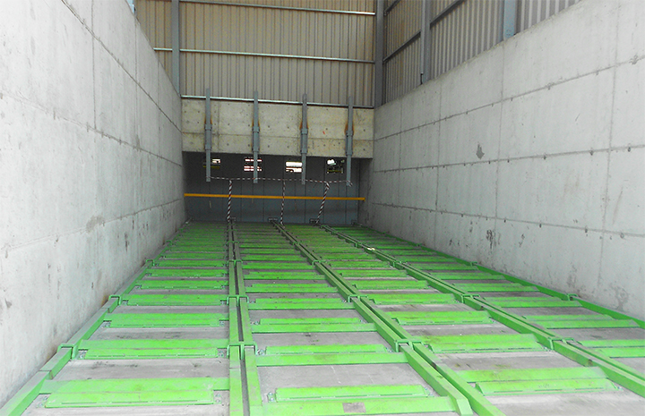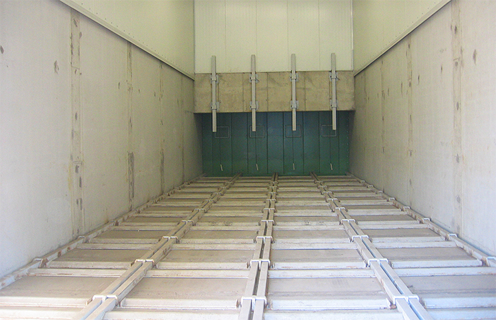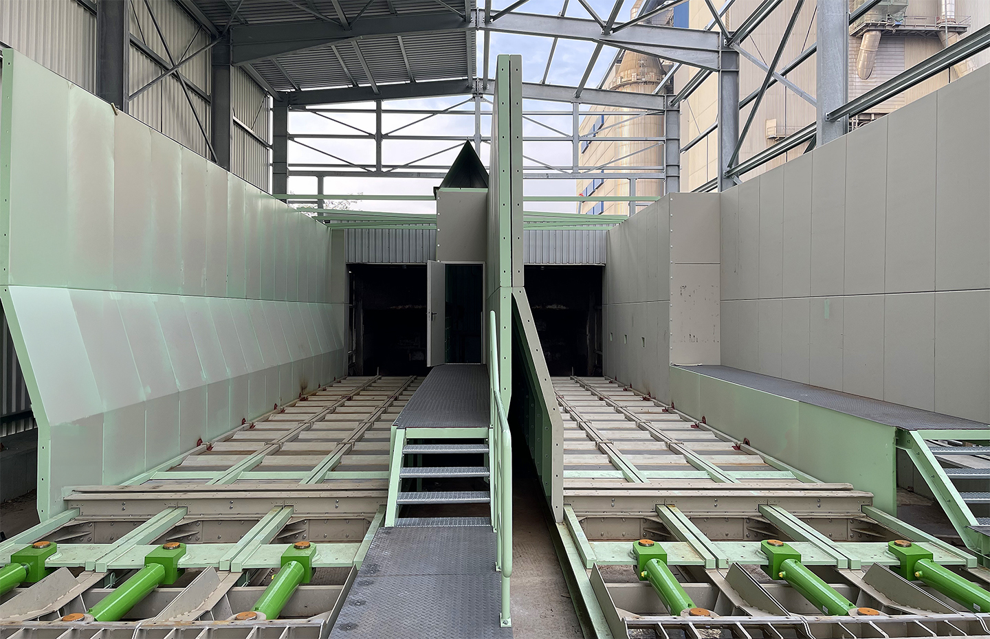 With structural lengths of up to approx. 30 m and variable widths, the system can be adapted to different storage geometries. The design allows truck or wheel loader access, enabling intermediate storage areas to be functionally integrated into the material flow. Depending on configuration, silo volumes of up to approx. 2,000 m³ can be realised. Discharge capacity can be adjusted to process requirements via the travel speed of the floor elements.