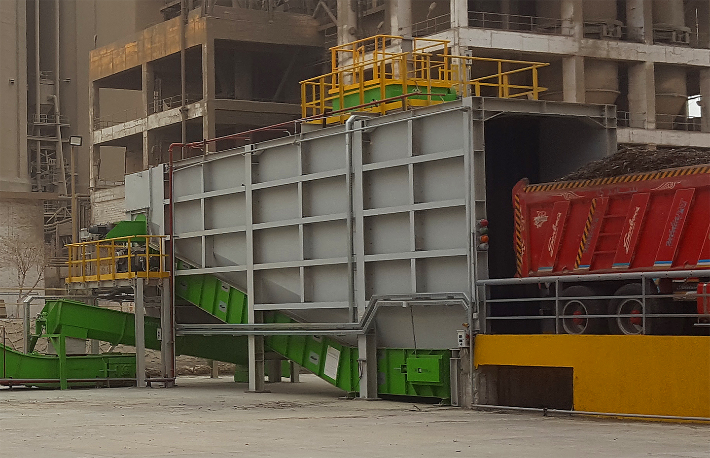 - Movable service walkway integrated inside the conveyor for maintenance and inspection, accessible behind the truck trailer doors